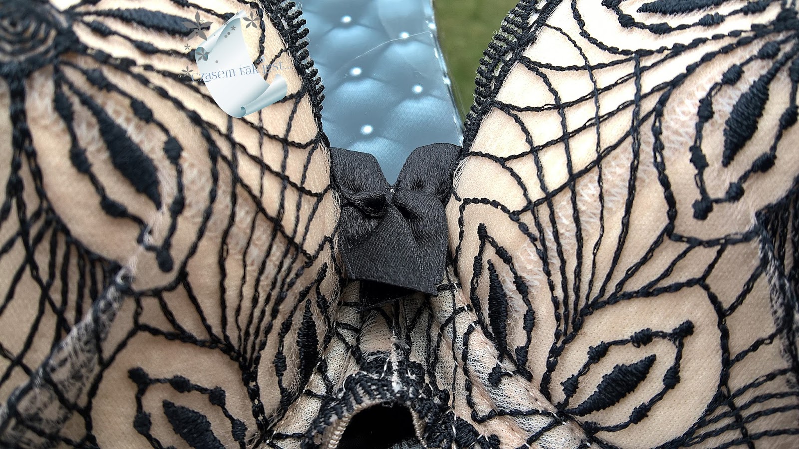 Bielizna utrzymana jest w beżowej tonacji, z czarnymi haftami. To zestawienie kolorystyczne daje efekt delikatności, a zarazem zmysłowości. Z jednej strony kontrastowy haft, delikatny kolor, a z drugiej strony praktycznie przezroczyste figi. Na prawdę robi to niesamowite wrażenie. Całość wykonana jest z tiulu, tak delikatnego, że sprawia wrażenie utkanego z pajęczyny. Biustonosz posiada odpinane ramiączka, ozdobione fikuśnymi kokardkami. Jest to stanik typu push - up, bo tylko takie noszę. Jak już pisałam kiedyś, pewne mankamenty właśnie takim stanikiem można skutecznie zatuszować, a przez to wyglądać bardziej atrakcyjnie. Noszę rozmiar 80 B, stanik, który posiadam ma na metce rozmiar 75 B, mimo to jest na mnie w sam raz. Mogę stwierdzić, że na 85 B też byłby idealny z racji regulowanego zapięcia. Świetnie podnosi biust i jest miły w dotyku. Za to figi, to już wyższa szkoła jazdy :). Więcej odkrywają, niż przykrywają. Całe wykonane są z beżowego, cielistego, półprzezroczystego tiulu. Jedyne nieprzezroczyste kawałki znajdują się na wysokości bioder, co widać na zdjęciach (tam gdzie znajduje się haft). One również posiadają fikuśną kokardkę. W noszeniu są bardzo wygodne. Żadne szwy itp. nie są wyczuwalne. Świetnie podnoszą i formują pośladki. Opinają je odpowiednio, nie powodując efektu "baleronu".